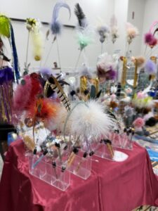 ハンドメイドの猫じゃらしがとにかくかわいかった!羽根やポンポン、フェザーを使った手作りのものがずらっと並んでいて、一本一本デザインが全部違うんです。見ているだけでも楽しいし、クオリティも高くてびっくりしました。猫カフェ目線で見ても、素直に「いいな」って思えるものばかりでした。